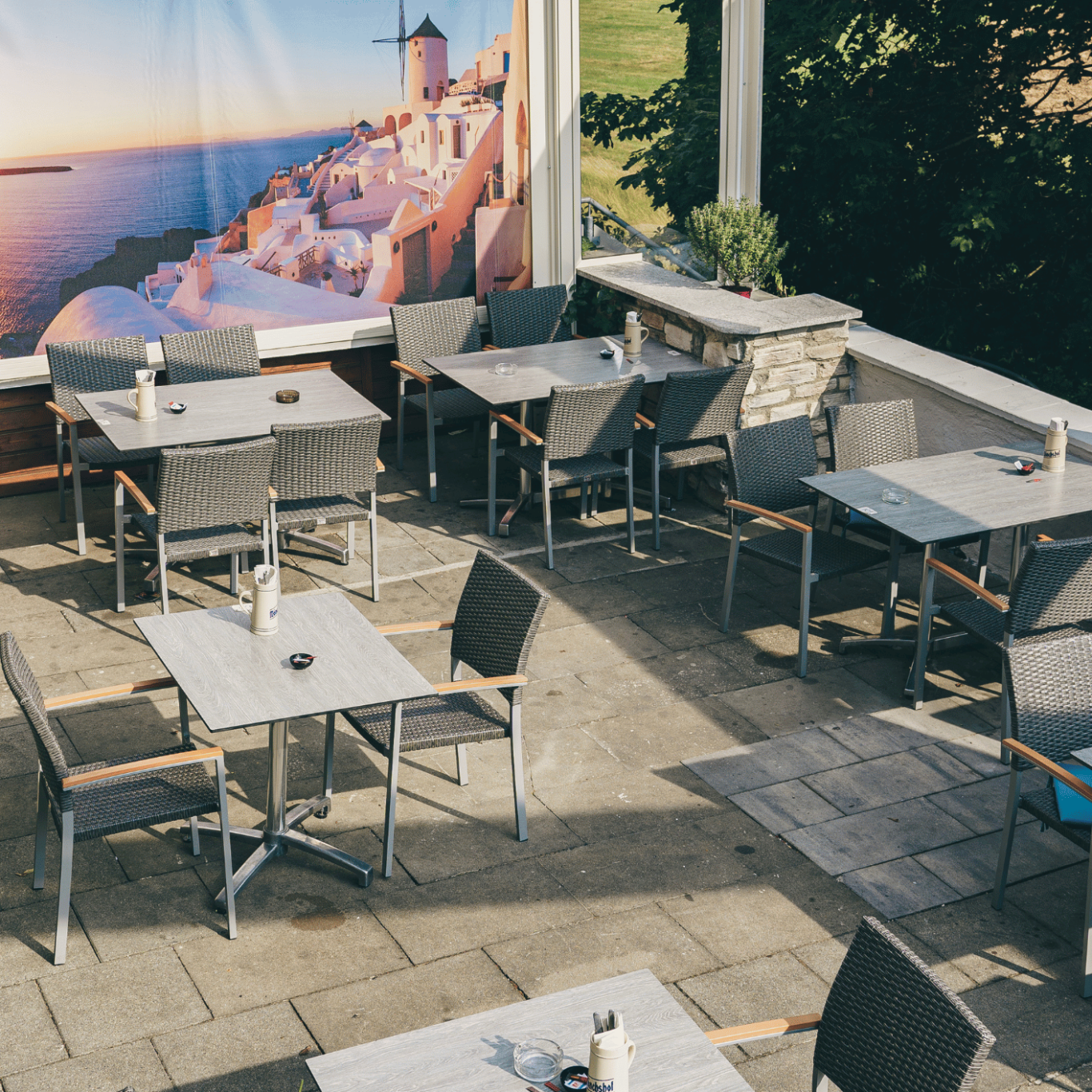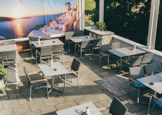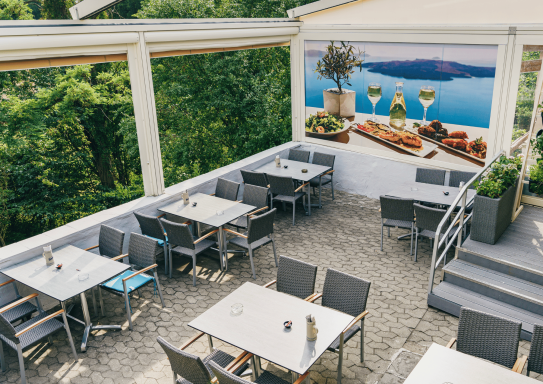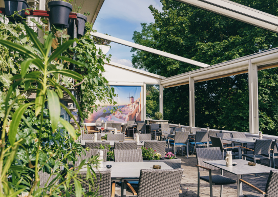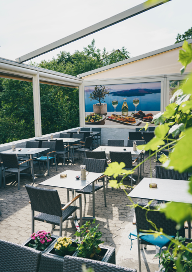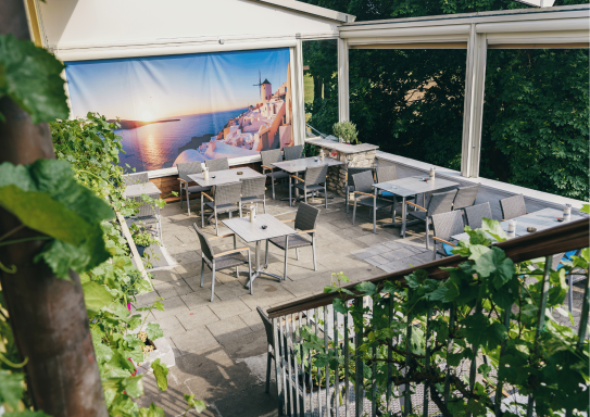 Unsere großzügige, überdachte Terrasse bietet Ihnen die perfekte Kombination aus griechischer Lebensfreude, frischer Luft und mediterranem Flair – direkt im Herzen von Stein bei Nürnberg.