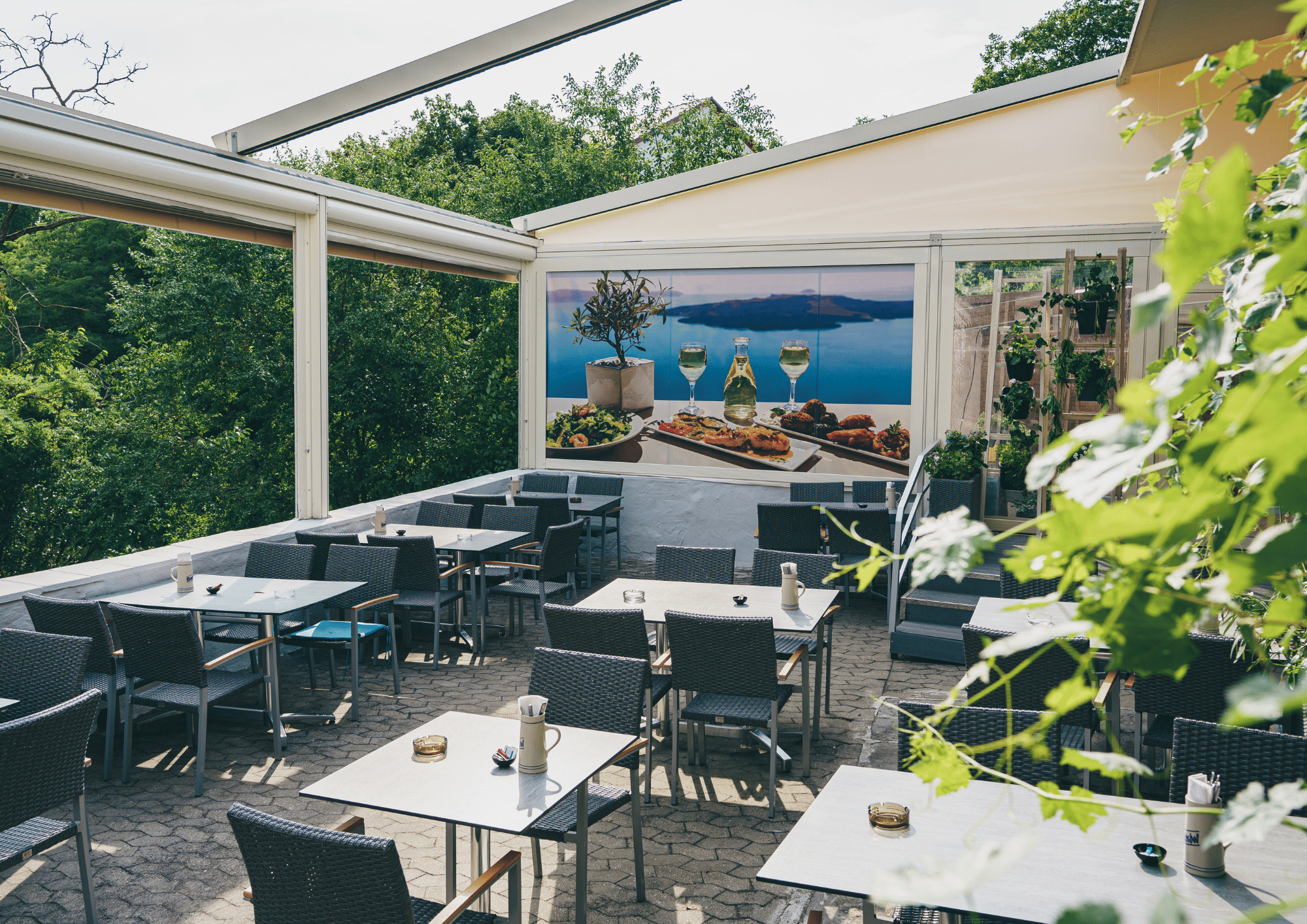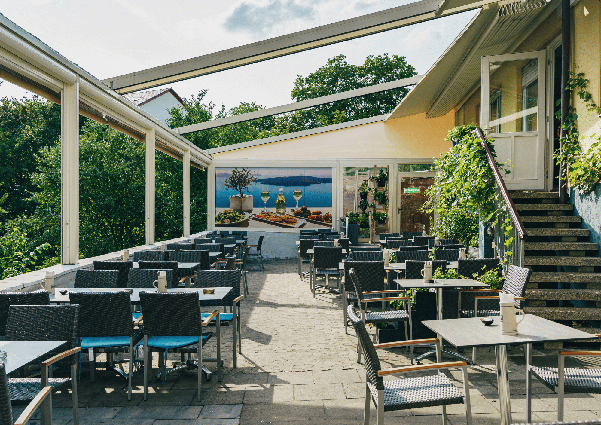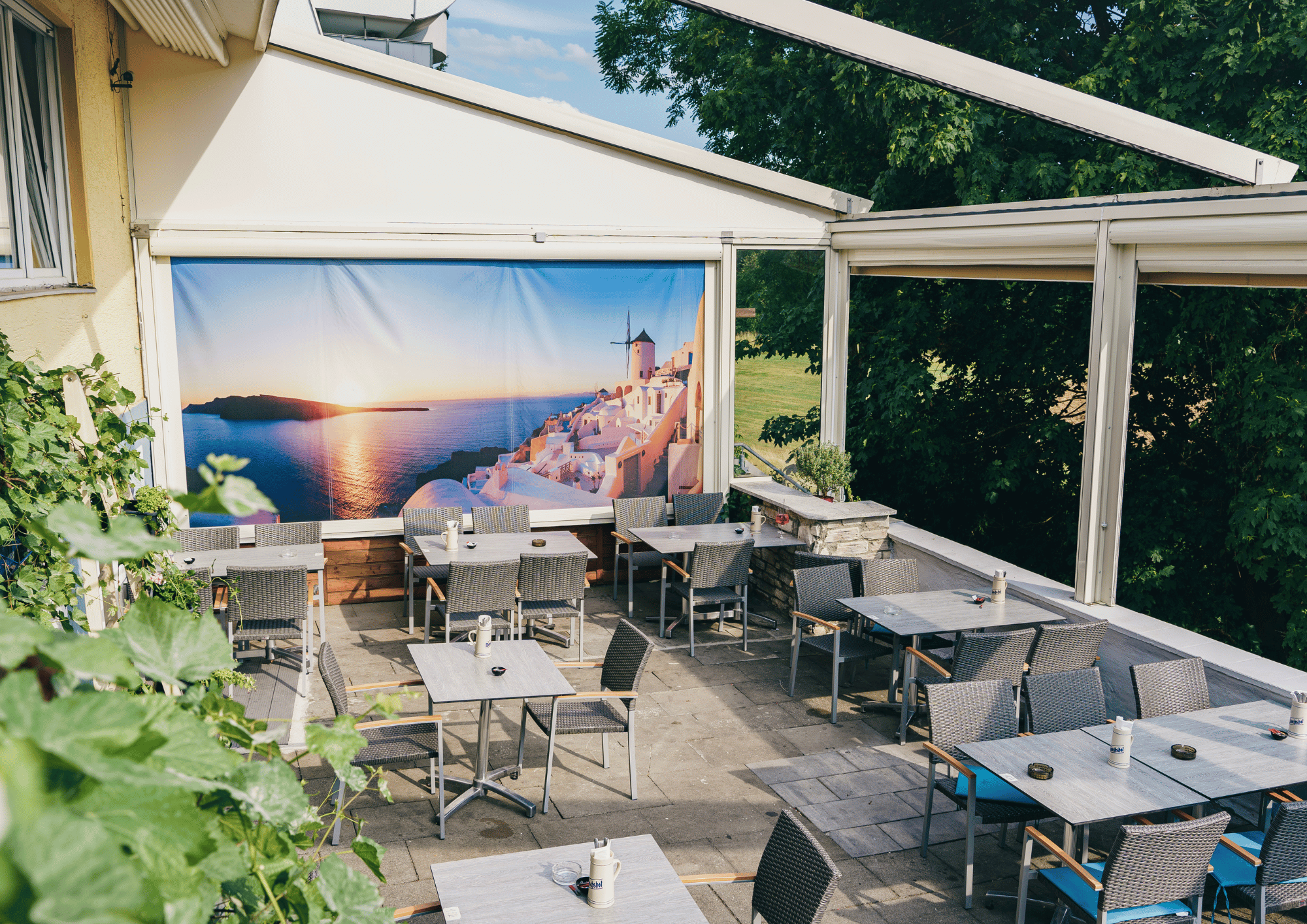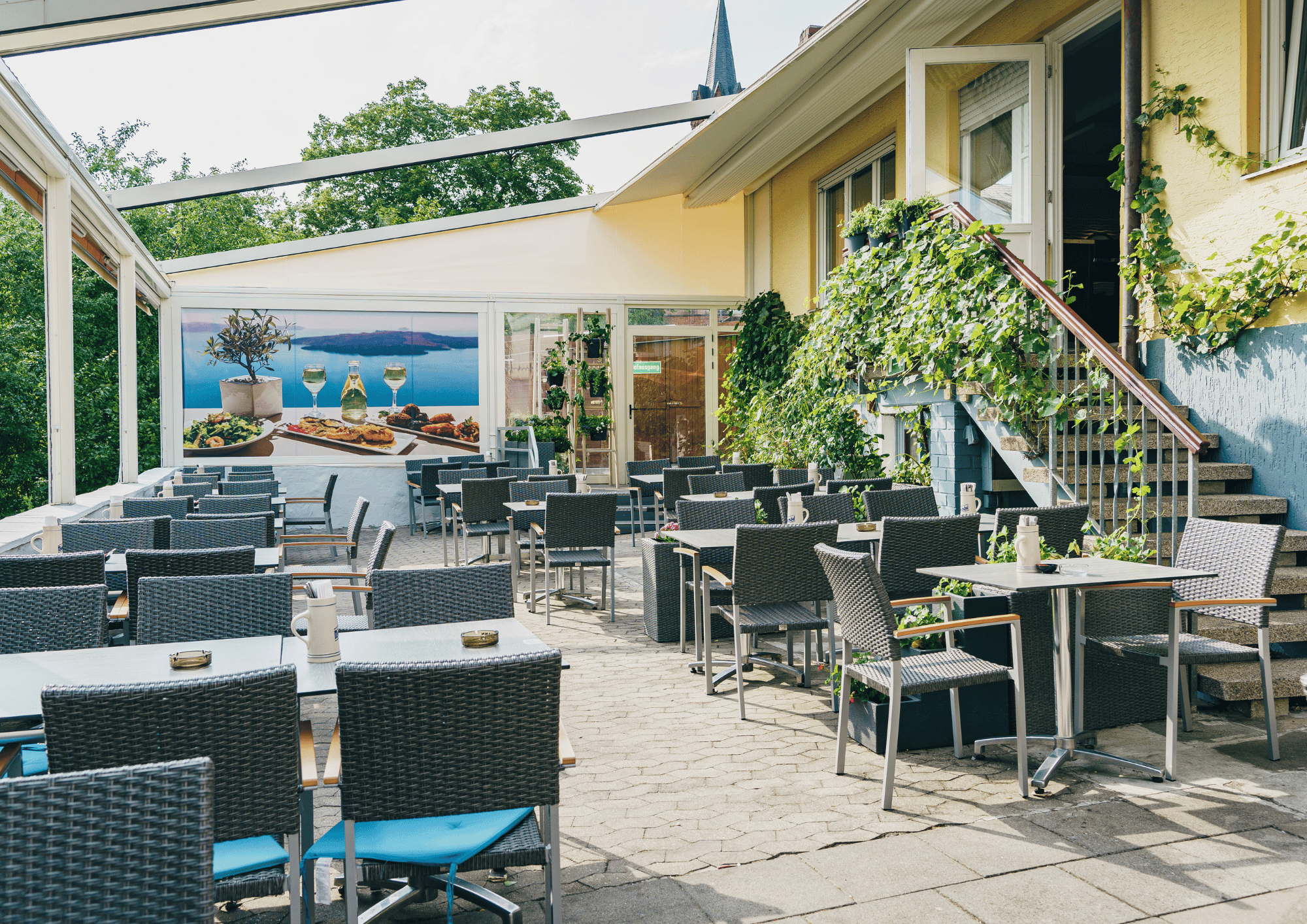 Unsere großzügige, überdachte Terrasse bietet Ihnen die perfekte Kombination aus griechischer Lebensfreude, frischer Luft und mediterranem Flair – direkt im Herzen von Stein bei Nürnberg.
